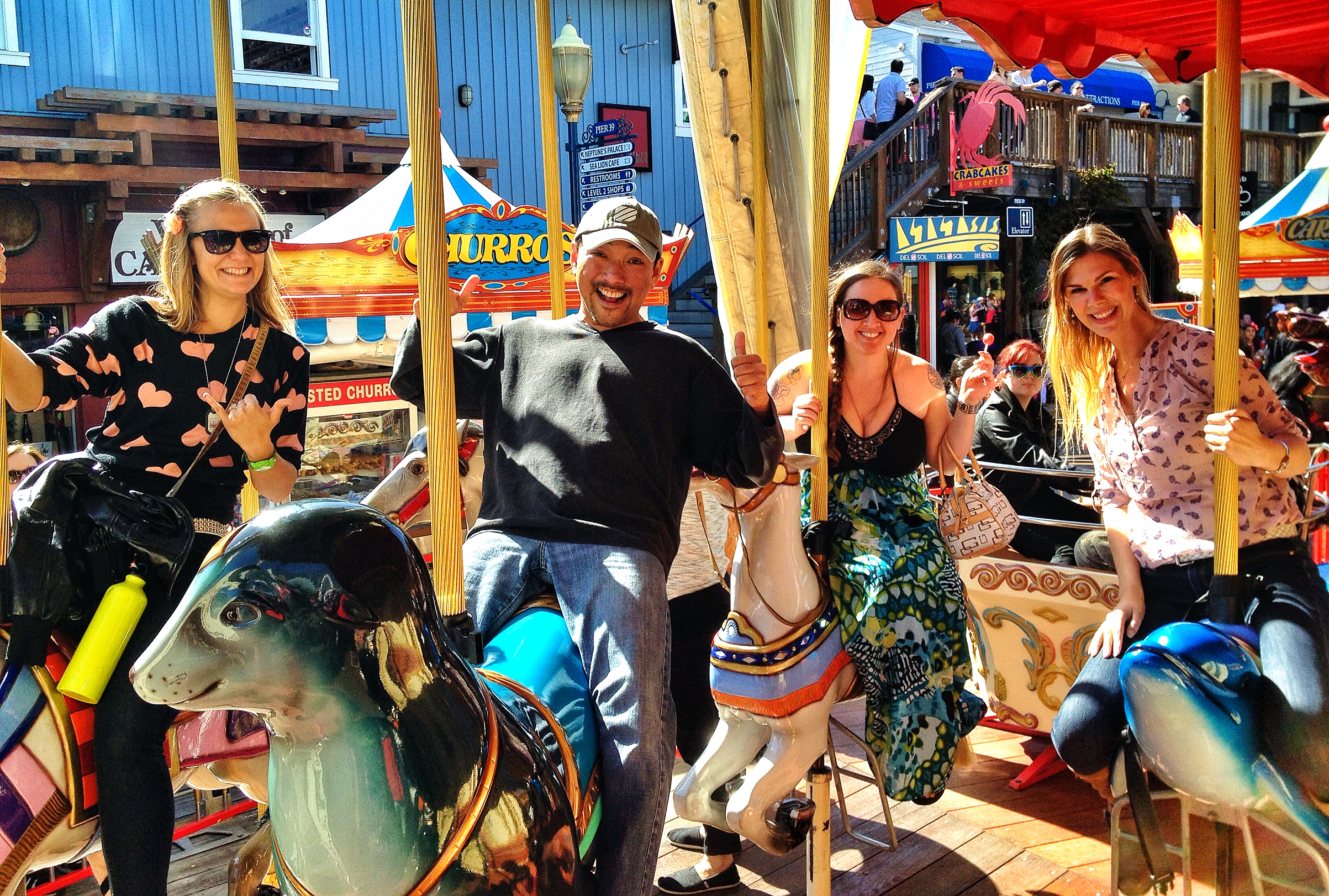 We raced over to buy our tokens and to get in line. One by one we handed over our shiny, gold coins to the operator and then set out to find a conglomerate of four perfect creatures on which to take this marvelous three-minute journey. We climbed aboard our valiant steeds, (or dolphin in my case), took a few group photos, and then we were off! I don’t know if it was the calming wave-like rhythm of the ride, the wind in my hair, or our almost maniacal fits of laughter, but it was the perfect ending to our Pier 39 adventure.